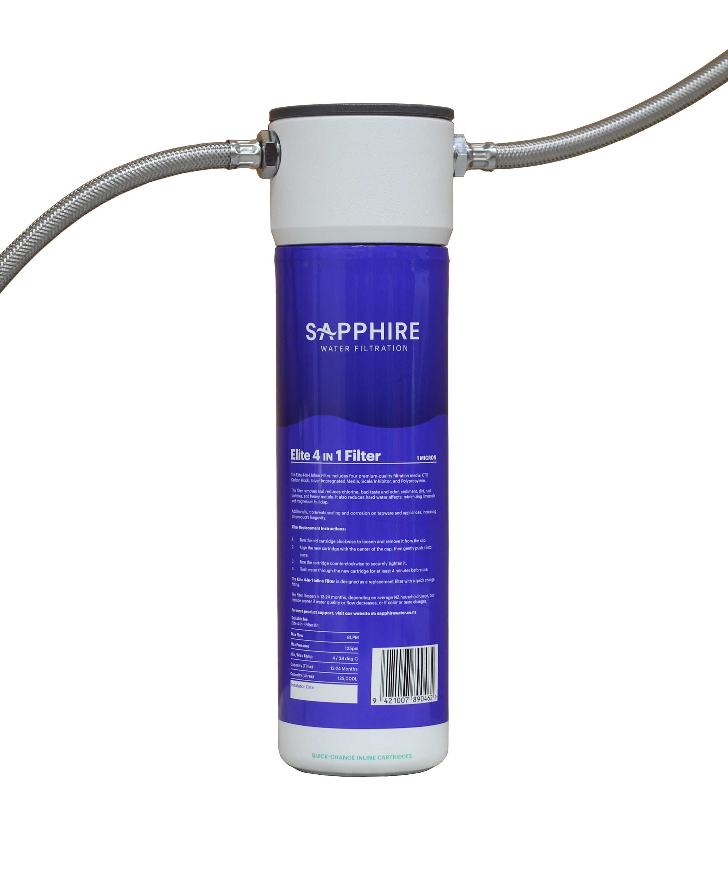 The Sapphire Elite 4-in-1 Filter Kit is a compact, high-performance solution designed to deliver clean, great-tasting water directly to your kitchen. Engineered as an inline underbench system, it integrates four advanced filtration media into a single, efficient unit. With its innovative quick-change feature, replacing the filter is effortless, ensuring seamless maintenance and consistent performance.